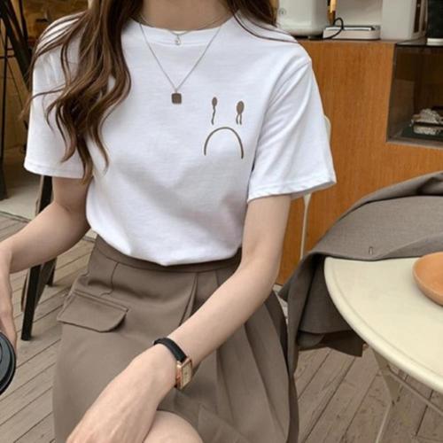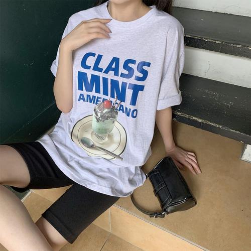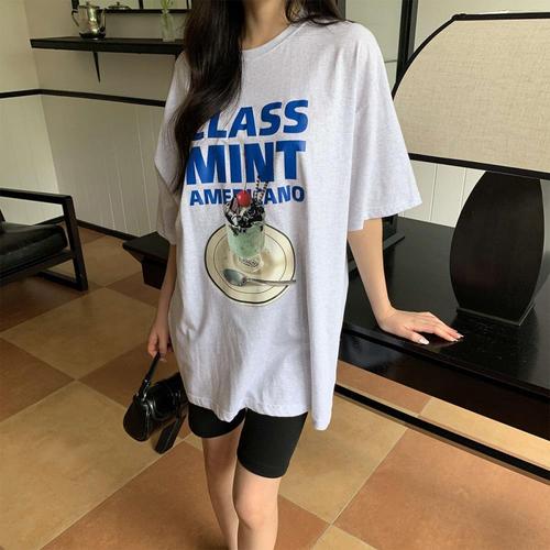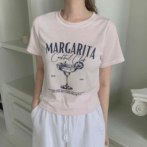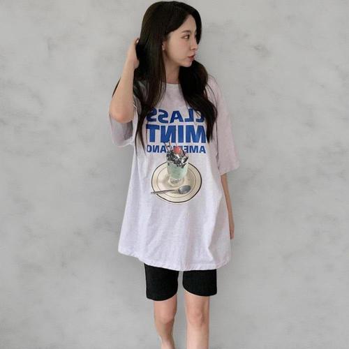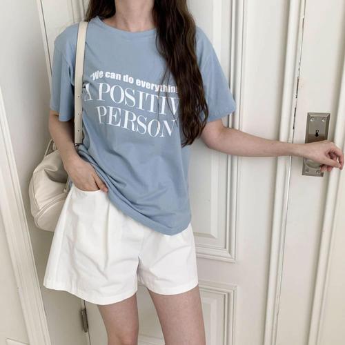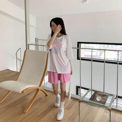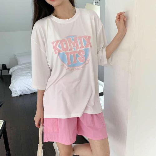 여성 코튼100 U넥 박시핏 필기체 나염 반팔티