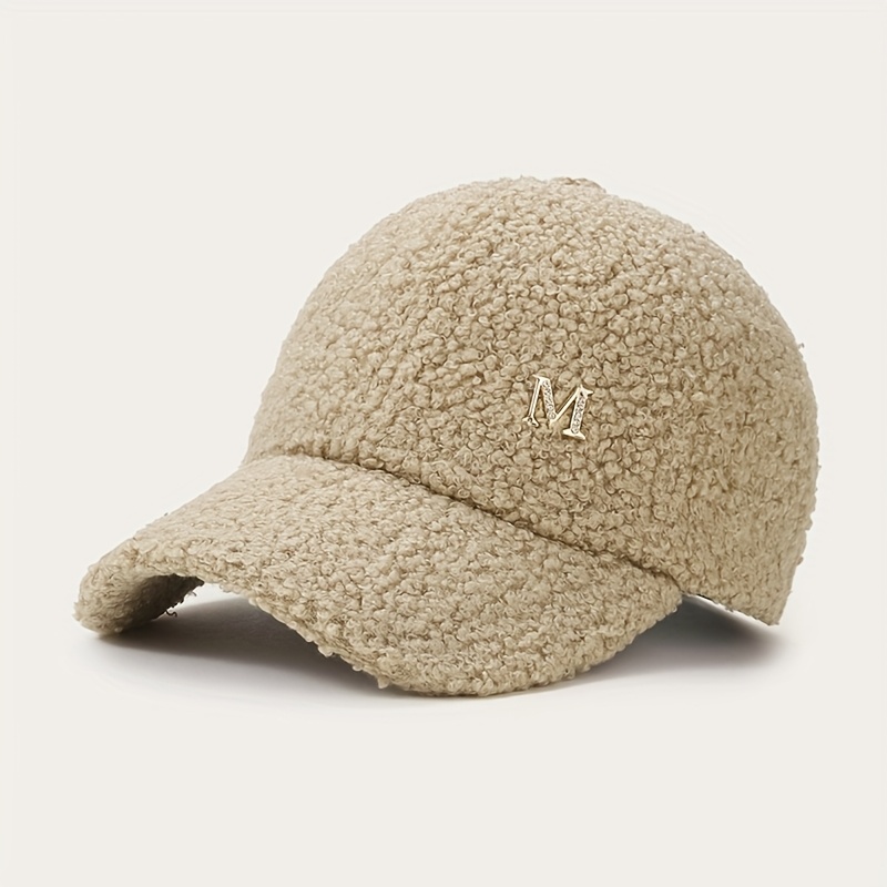 TEMU 여성용 겨울 베이스볼 캡 - 메탈릭 'm' 액센트, 조절 가능한 스냅백 클로저, 소프트 베이지/브라운/블랙/그레이, 가벼우면서 따뜻한 일상/오피스/파티용, 캐주얼 시크한 디자인, 편안한 착용감, 스타일리시 헤드웨어, 패션 애호가를 위한 실외용 모자|볼캡|스냅백
