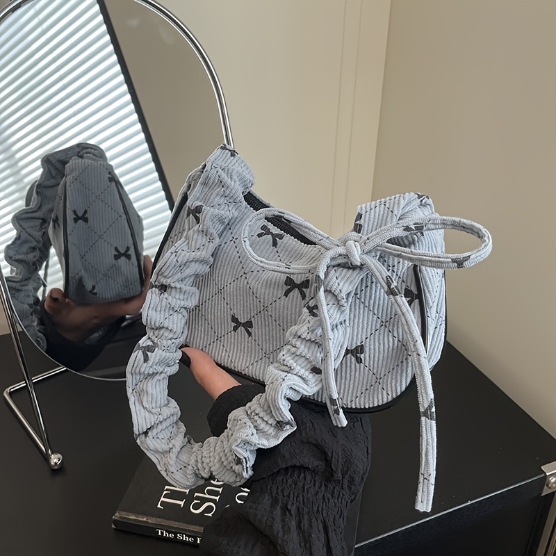 TEMU A Corduroy 여성용 엘레강스 숄더백. 리본 자수 액세서리 - 조절식 스트랩 - 지퍼 잠금 - 폴리에스터 안감 - 숄더백 또는 핸드백으로 착용 가능 - 여성용 귀엽고 컴팩트한 겨드랑이 가방