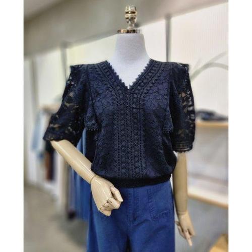 [의류] 여성 레이스 펀칭 프릴 넥 라인 반팔 블라우스