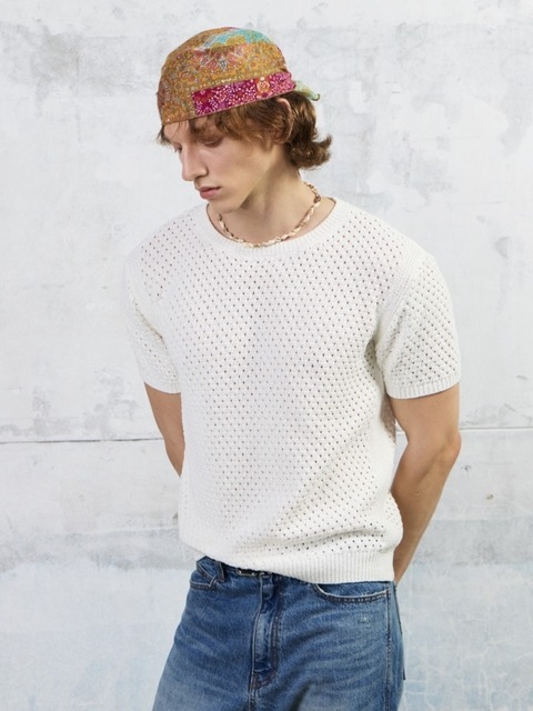 [쿠메] Men Waffle Crochet Short Sleeved Knit Top, Ivory