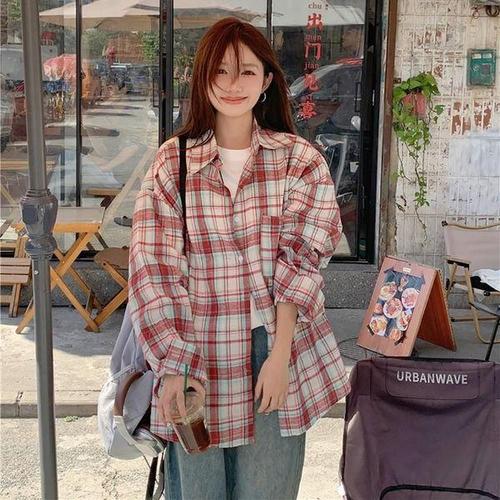 [에이치플러스몰]오버핏룩 레드 레이어드셔츠 레드셔츠 캐주얼 오