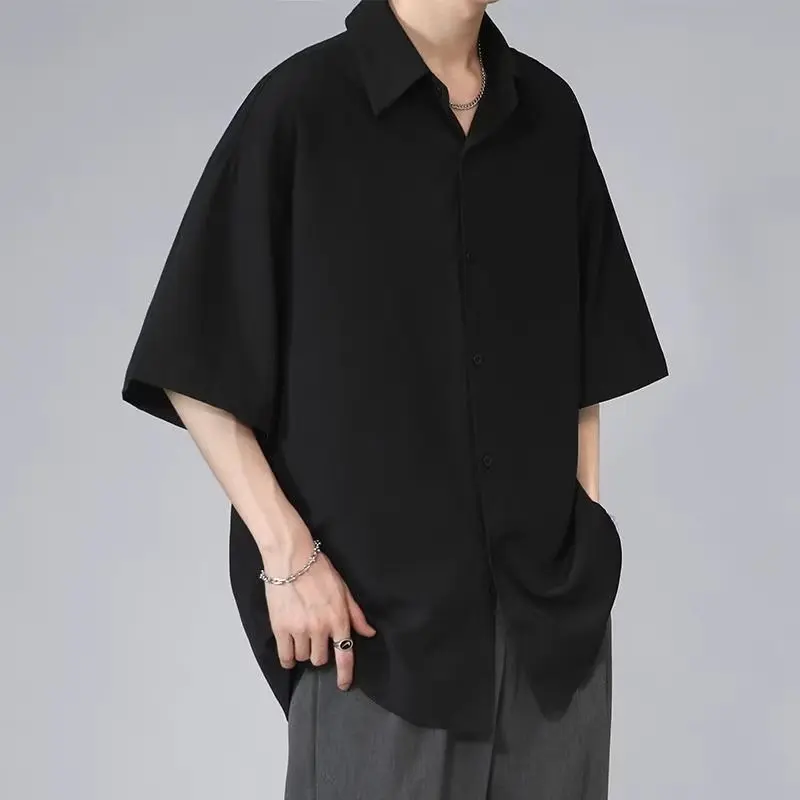 남성용 아이스 실크 반소매 셔츠 캐주얼 루즈핏 한국 스타일 트렌디 블랙 셔츠 여름용 얇은 소매 캐주얼