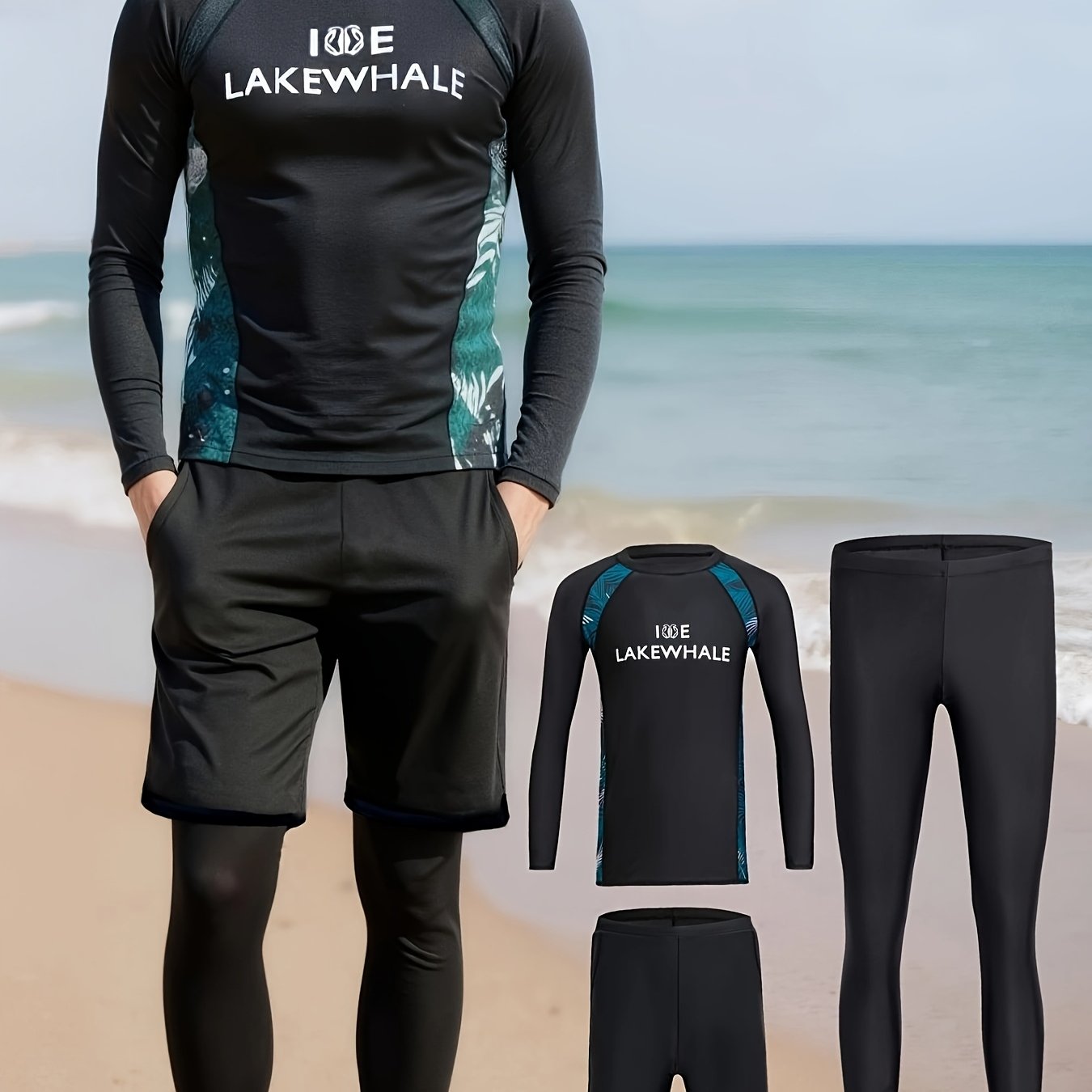 TEMU 신상 남성용 긴팔 수영복 세트 - 비치 서핑 트렁크 쇼츠 3종 세트|수영복