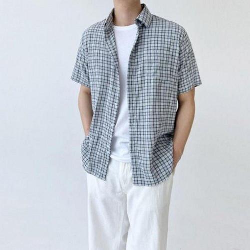 남성용 린넨 체크 오버핏 여름 반팔 셔츠 티셔츠 WFLMDRU