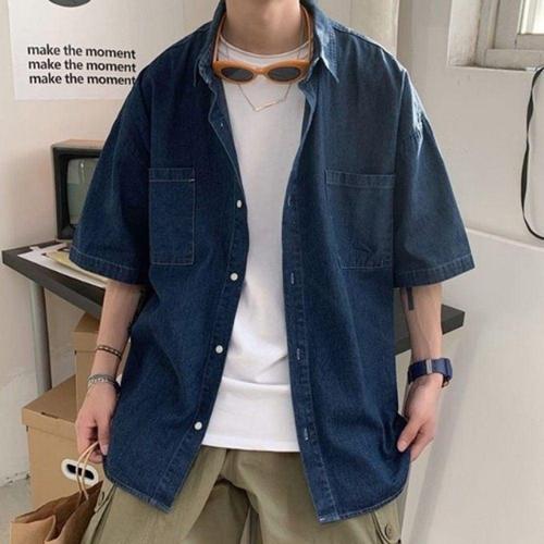 남자 여름 루즈 오버핏 릴렉스드 청 데님 반팔 셔츠 남방