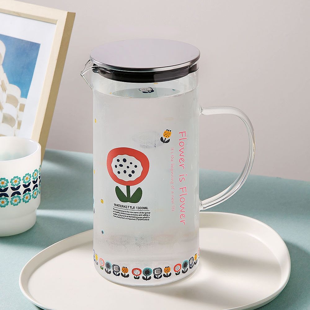 플라워 내열유리 스텐 뚜껑 물병 저그 대용량 손잡이 물통 1300ml