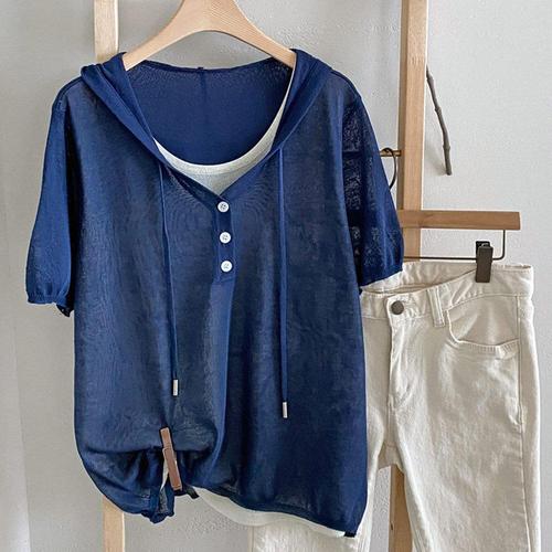 [샵앤][샵앤] 여성 반단추 레이어드 반팔 후드 니트티 JR-WKN-4531-네이비