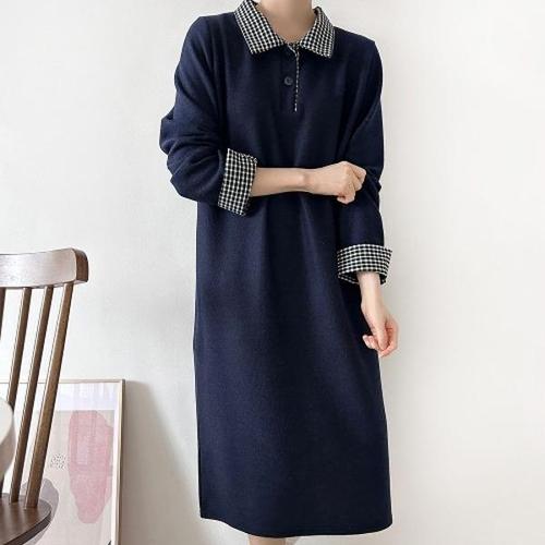 여자 배색 체크 카라넥 버튼 박시핏 네이비 롱원피스