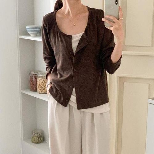 TEMU 우아한 여성용 드롭 숄더 가디건 - 부드럽고 신축성 없는 버튼업 스웨터, 가을과 겨울에 레이어링에 완벽하며, 대비되는 버튼 디자인 특징.