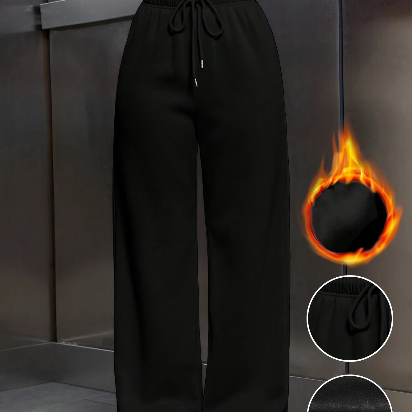 TEMU 여성 솔리드 컬러 두꺼운 따뜻한 안감 루즈핏 드로스트링 허리 밴드 와이드 레그 팬츠, 포근하고 편안하며 가을, 겨울 착용에 적합합니다.