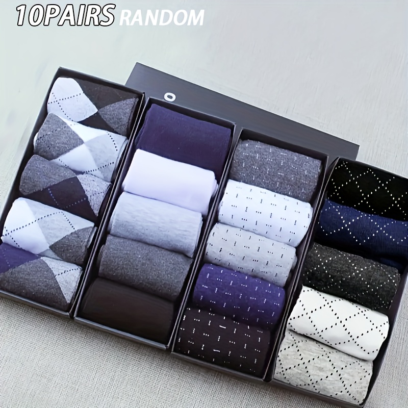 TEMU 5/10/20켤레 랜덤 선택 중간 길이 양말 - 편안하고 따뜻한 남성용 양말, 캐주얼 비즈니스 기하학 패턴, 가을/겨울 데일리 착용