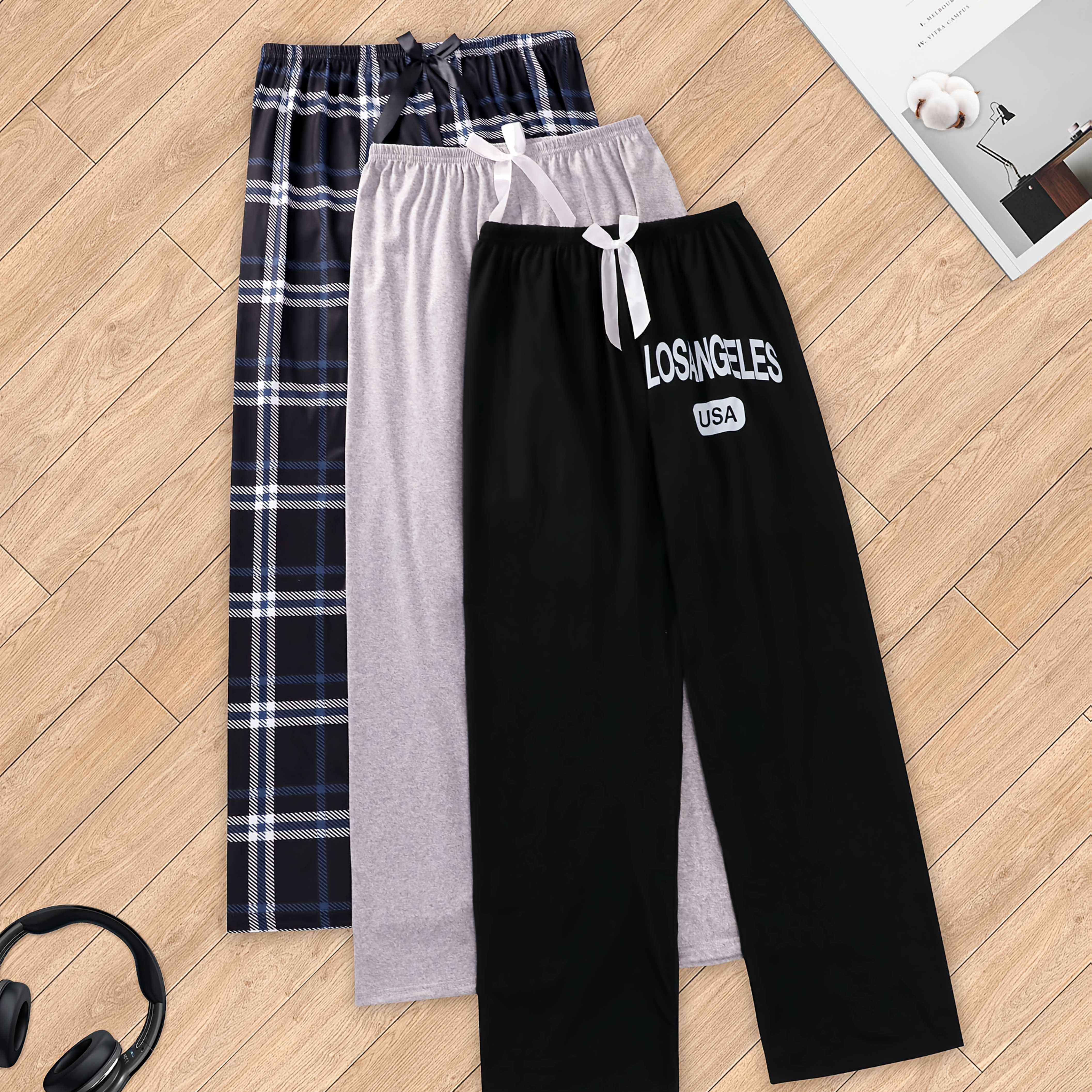 TEMU 2025년 여성 패션 캐주얼 바지 - 체크 프린트 및 블랙, 라이트 그레이 편안한 3피스 탄성 허리 밴드 (리본 디테일), 착용 가능한 라운지웨어 잠옷