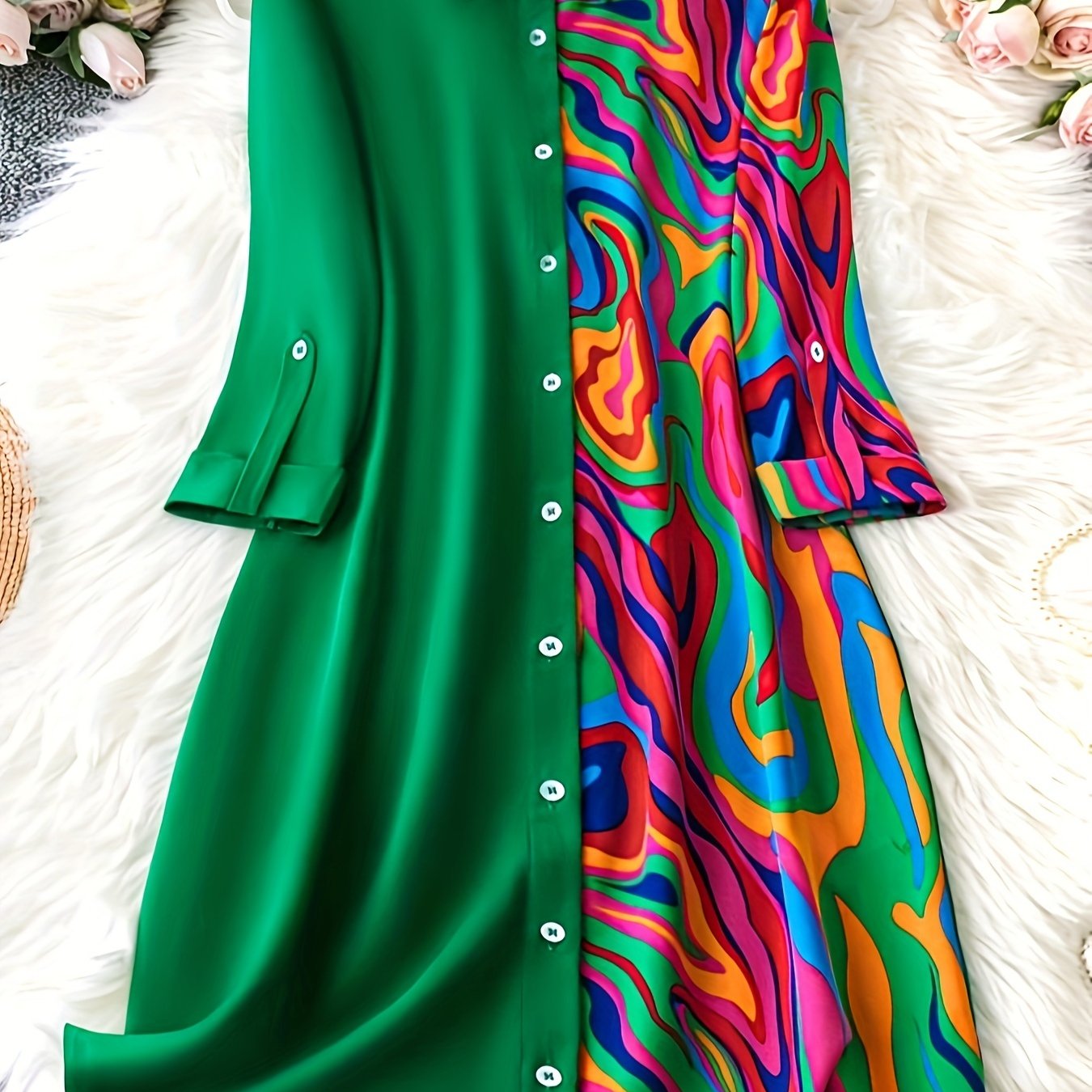TEMU 여성용 세련된 파란색과 화려한 꽃 패치워크 드레스 - 긴 소매, 버튼 업, 가을/겨울 패션, 성인용, 가을 겨울 드레스 | 화려한 꽃 무늬 | 라펠 칼라 드레스