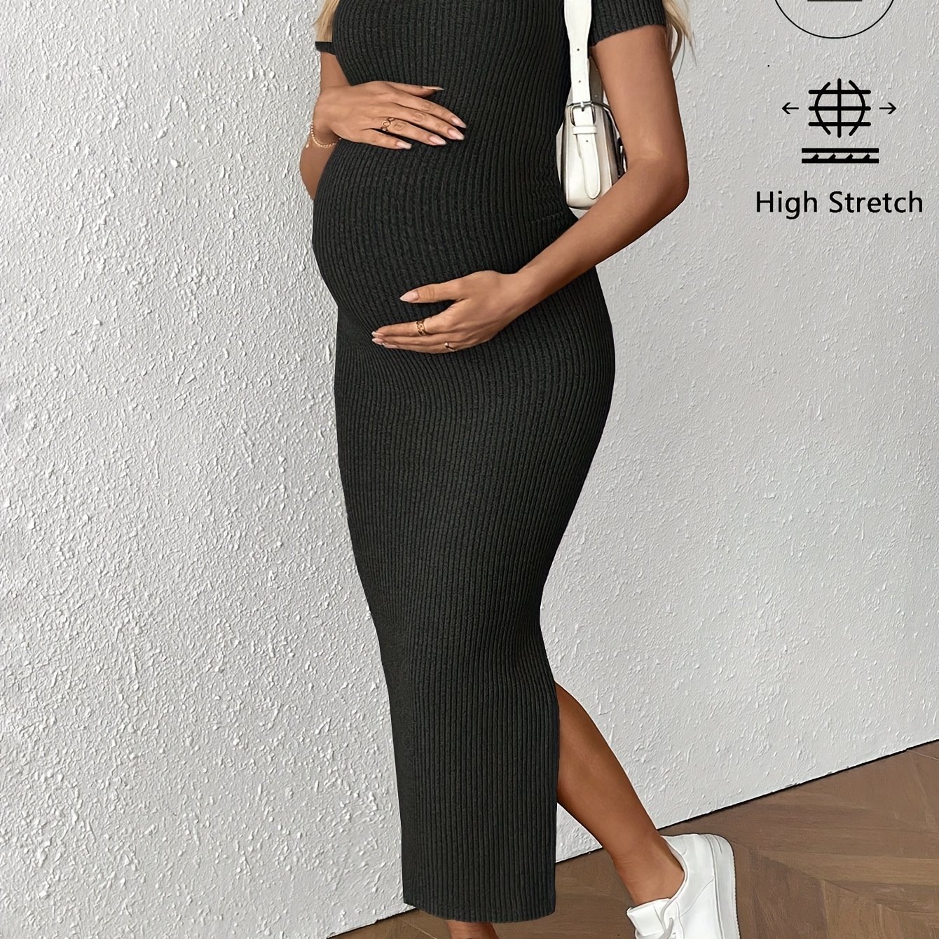 TEMU 임신부용 바디콘 드레스 - 스퀘어 넥 반팔 주름 헴 스트레치 니트 여름 캐주얼 의류, 통기성 좋은 솔리드 컬러 레귤러 핏, 세탁 가능, 편안한 임산부 복장, 우아한 임신복, 신축성 있는 소재|임부복