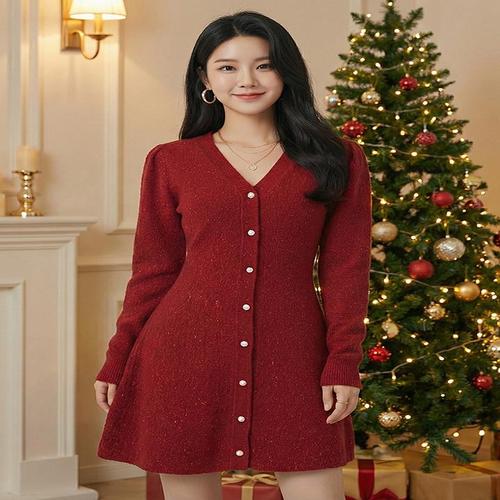 르피타 DP01 금장버튼 브이넥 니트 원피스 L244UOKB03