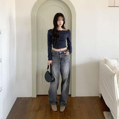[미라클세븐]여자 심플 잔골리 퍼프 숄더 셔링 긴팔 니트
