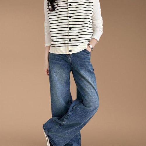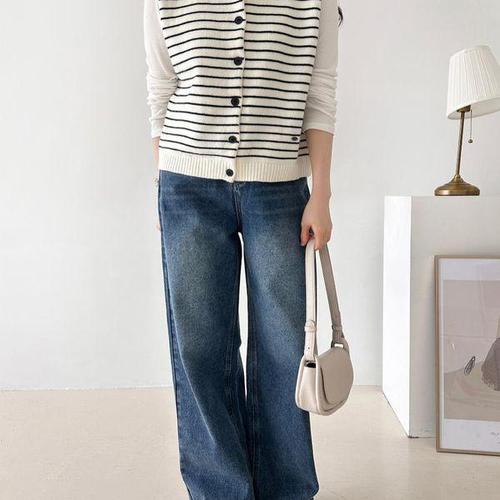 [신상오픈런]여성 클래식 스트라이프 면혼합 버튼 라운드 니트 조끼