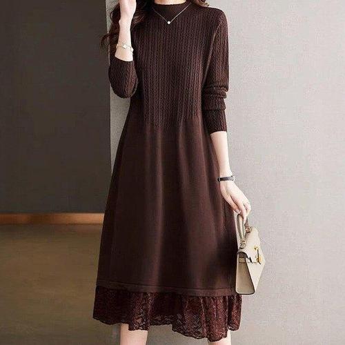 POMTOR 여성 고급스러운 빈티지 빅사이즈 허리끈 언발 니트 미디 원피스