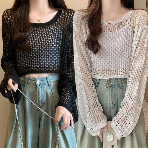[신상오픈런]여성 여름 휴가 커버업 펀칭 긴팔 크롭 니트