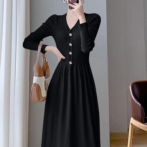 블랙 니트 원피스 플레어 스커트 브이넥 A라인 여성 골지원피스 WFNQJOA