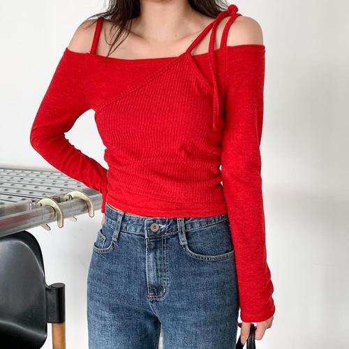 [옷자락] 여성 레이어드 나시 오프숄더 크롭 긴팔 니트