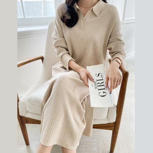 플레어 롱원피스 긴팔 하객룩 니트 카라 원피스 WFLRZGA