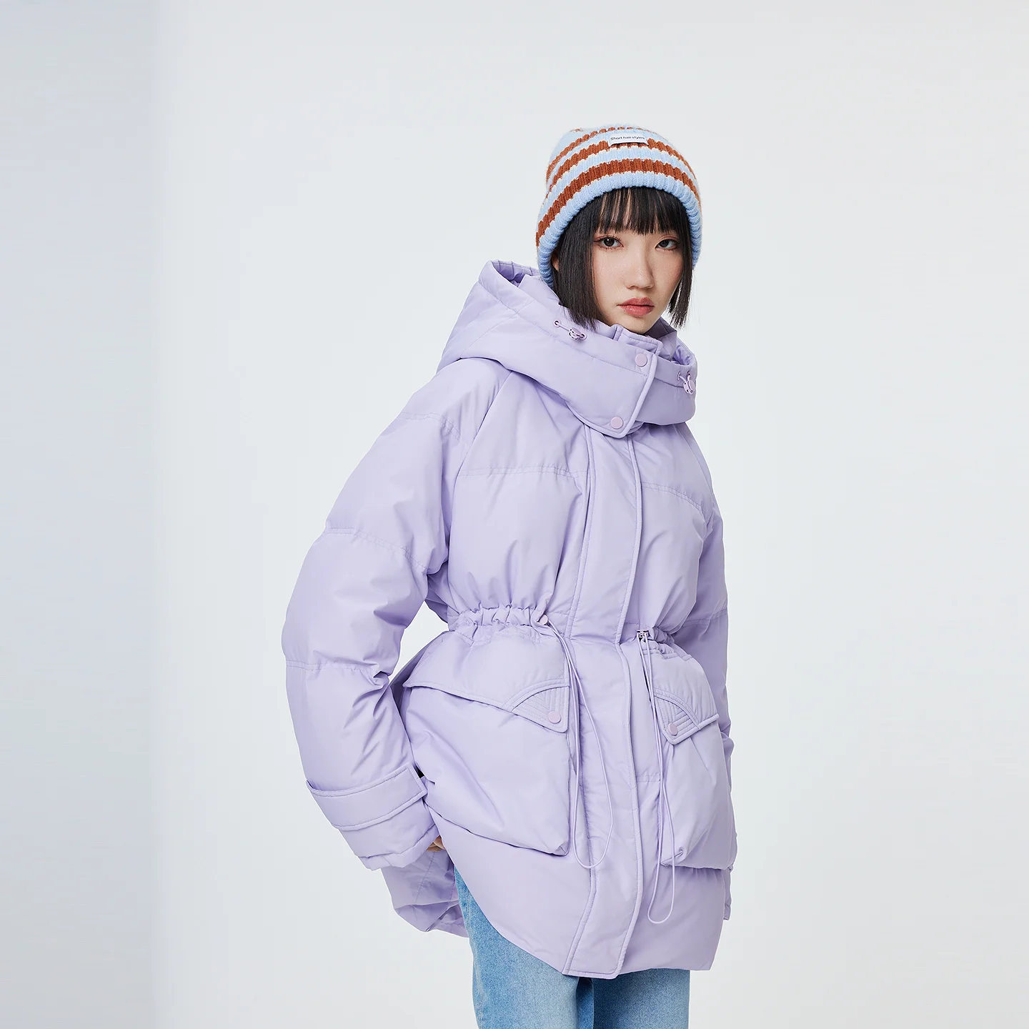 Metersbonwe 여성용 오버 사이즈 롱 후드 다운 재킷 조절 가능한 돼지 코 버클 허리 벨트 유틸리티 오리 다운 파카 따뜻한 겨울
