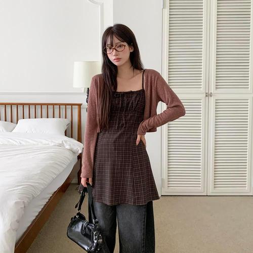 [옷자락]여성용 체크 무늬 코튼 미니 원피스 리본 어깨끈