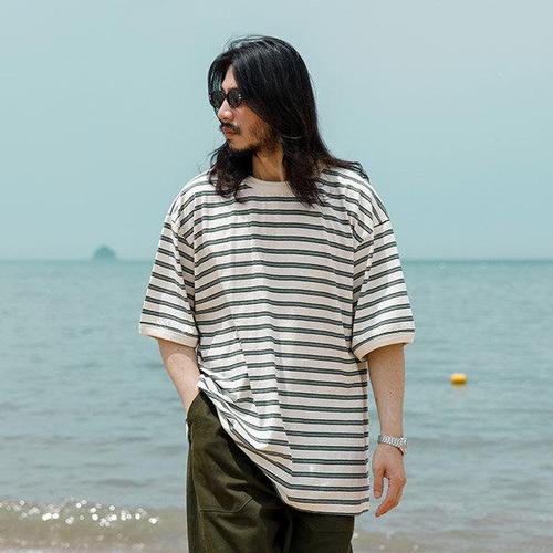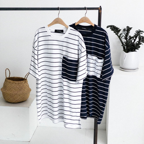 제이엘핏 / 오버핏 덤블 워싱 스트라이프 포켓 박스 반팔티