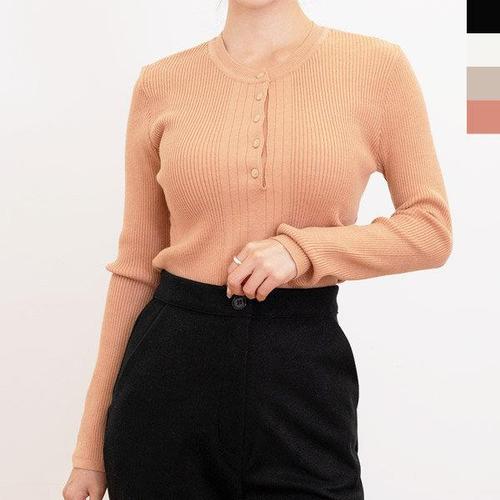 나바바 / NT3194 여성 무지 골지 버튼 라운드넥 긴팔 티셔츠
