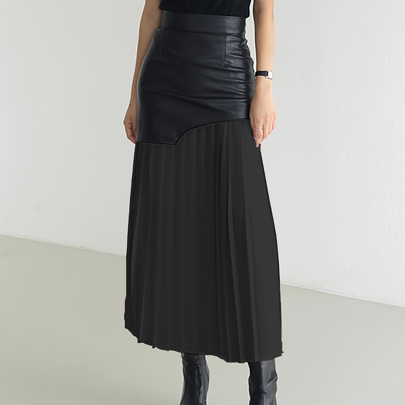 TEMU 여성용 우아한 비대칭 주름 미디 스커트 - 하이웨이스트, 투톤 블랙 & 화이트, 폴리에스터 쉬폰, 세탁기 사용 가능, 가을/겨울 패션에 완벽