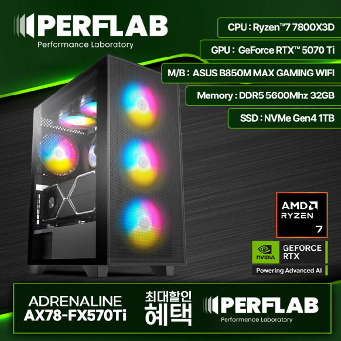PERFLAB 라이젠7 7800X3D RTX 5070 Ti 16GB 32GB 1TB 게이밍 컴퓨터 데스크탑 조립 PC