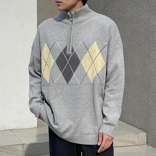 [더맨쉽][더맨쉽] 오버핏 아가일 패턴 반집업 니트 스웨터