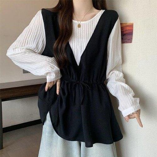 [아리엘스타일]페이크레이어드 라운드넥 블리츠블라우스