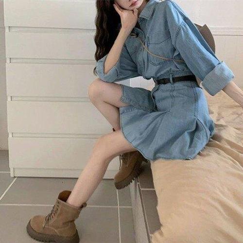 [아리엘스타일]벨트포인트 데님플레어 봄데님 코마루데님원피스