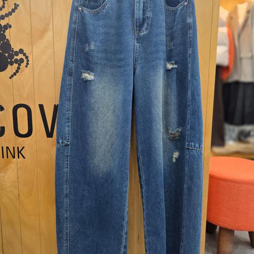 [옷자락]여자 언발 무릎컷팅 와이드진 루즈핏 데미지 청바지