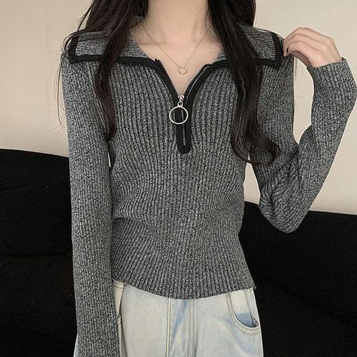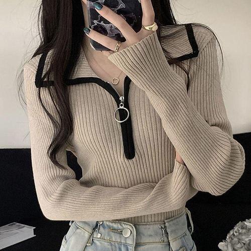 여성 골지 카라 반지퍼 슬림 데일리 니트 티셔츠 WFL8V7Y