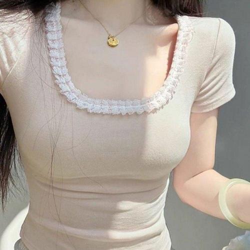 여성용 레이스 크롭 반팔 티셔츠 데일리 스타일 유행 아이템 WFL95AZ
