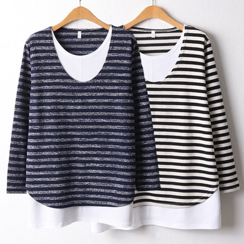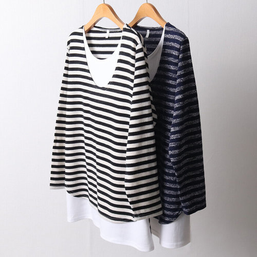 나야홍 / 빅사이즈 601 이중배색줄지롱티셔츠 DMNF543