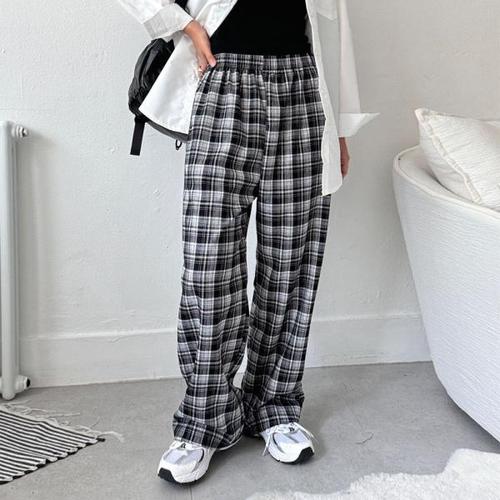 [문에이블]문에이블 허리 밴딩 편안한 데일리 룩 체크 패턴 와이드 롱 팬츠