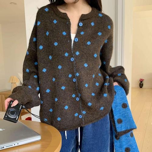 폴카 도트 니트 가디건 여성 봄, 가을 새로운 스타일 레이어드 디자인 센스 다재다능한 슬리밍 긴팔 탑
