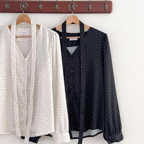 [마쟈]도트 패턴 리본 타이 쉬폰 블라우스