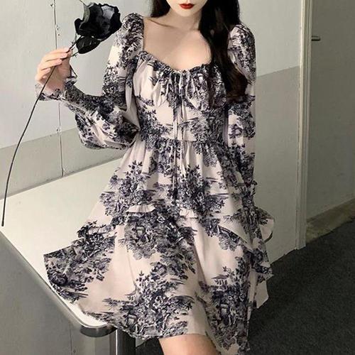 [셀럽하우스]독특한 AWFW4980 패턴 프릴 디자인 소매 밴딩 하트넥 원피스