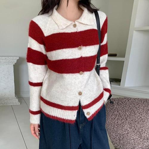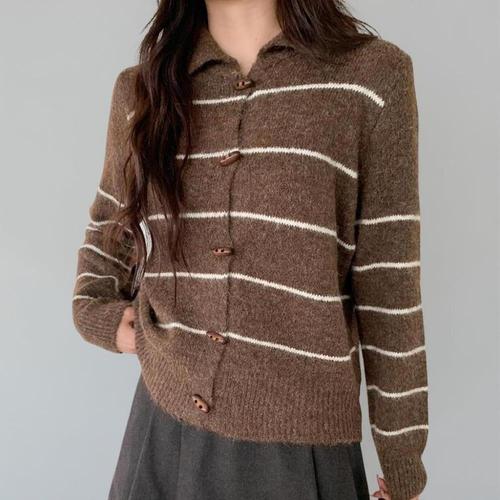 [신상오픈런]여성 카라넥 스트라이프 니트 가디건 두꺼운 디자인