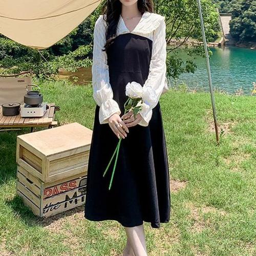 [옷자락]여자 임부 등원룩 가을오버핏 콘트라스트 둥근카라 롱원피스