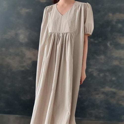 [신상오픈런]여성 가을 일상복 크롭 퍼프 소매 밴딩 롱드레스