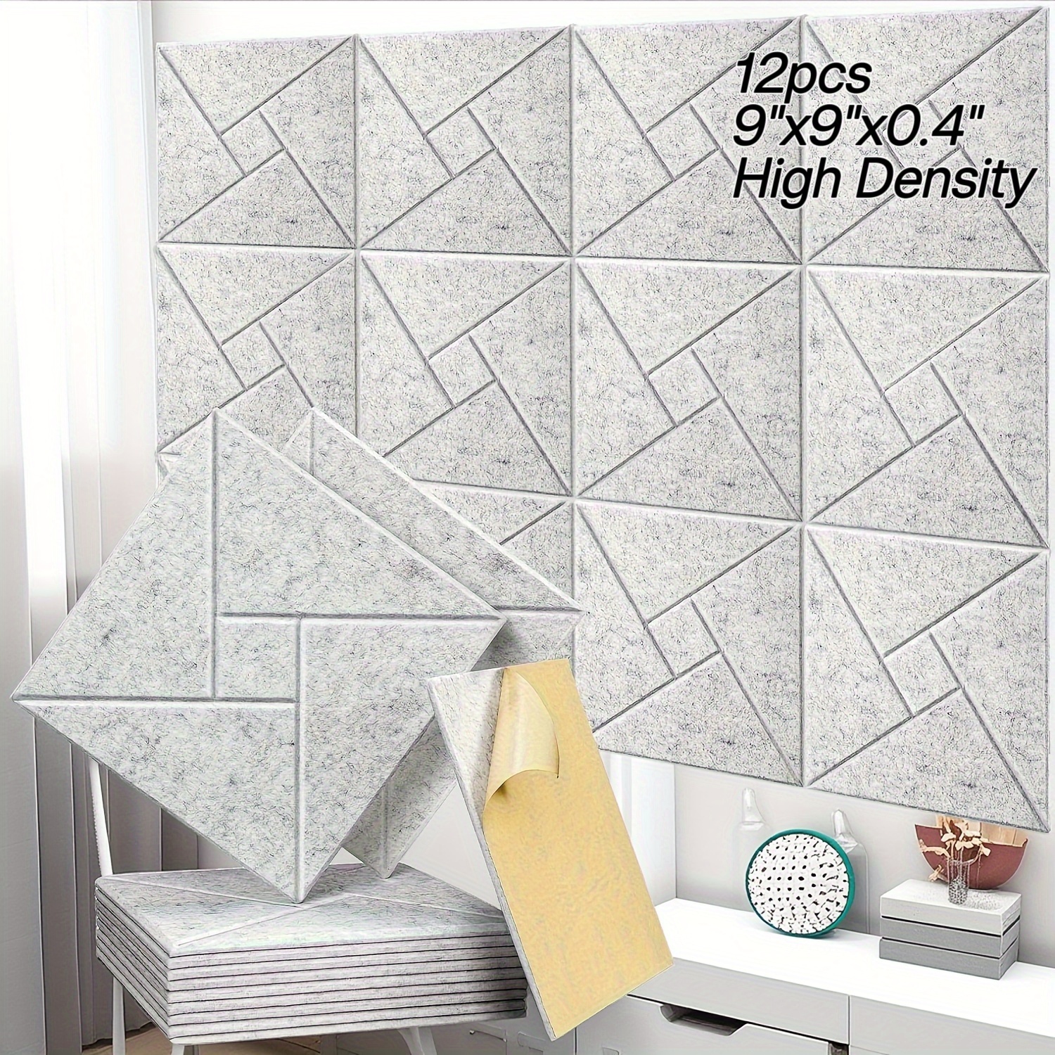 TEMU 12개 자가 점착 방음 벽 패널 - 고밀도 흡음재 패널, 떼어내어 붙이는 접착식, 9"x9"x0.4" 소음 감소 패널 (가정, 스튜디오, 사무실용), 간편한 설치 (도구/재단 불필요), 내구성 및 경량 디자인, 벽