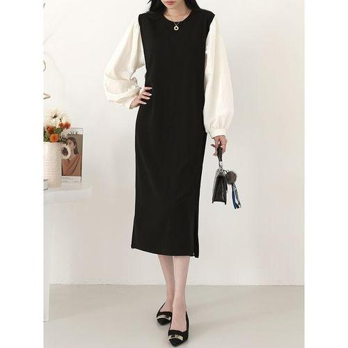 [시크루즈]스냅 바스락 소매 배색 루즈핏 원피스_BDOG999