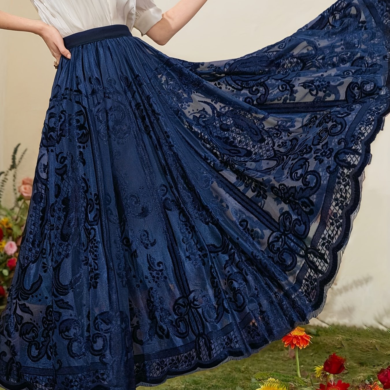 TEMU 우아한 다크 레이스 메시 미디 스커트, 하이 웨이스트 및 플레어 A라인 디자인, 매력적인 드레이프 및 플리츠 우산 스타일